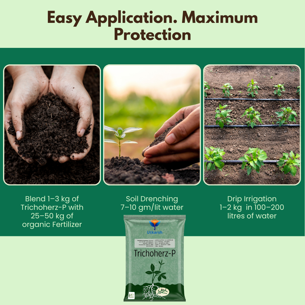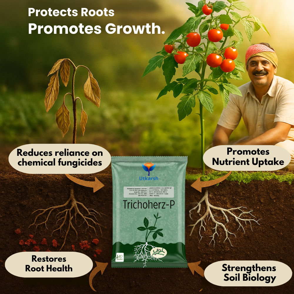 - Utkarsh Trichoherz-P protects crops from a wide range of soil-borne fungal diseases, reducing crop losses and increasing yield.
