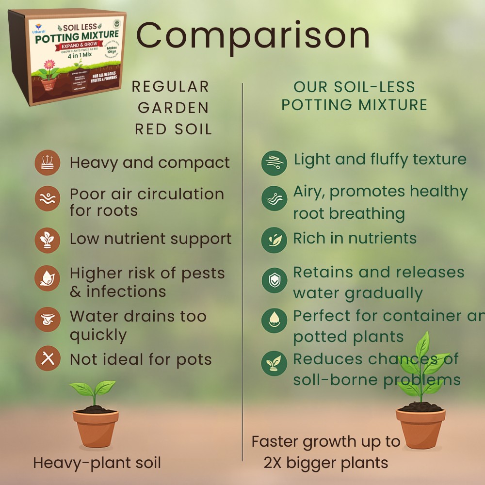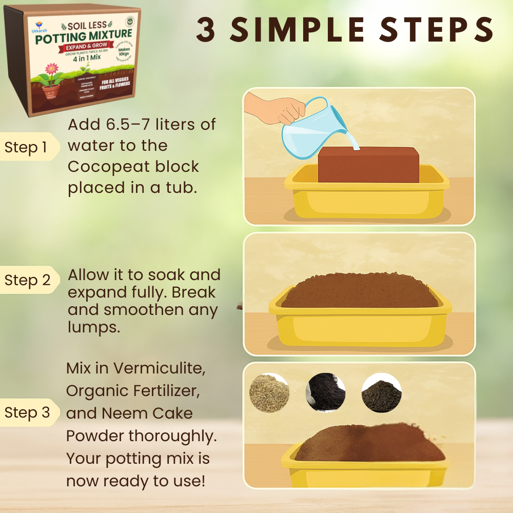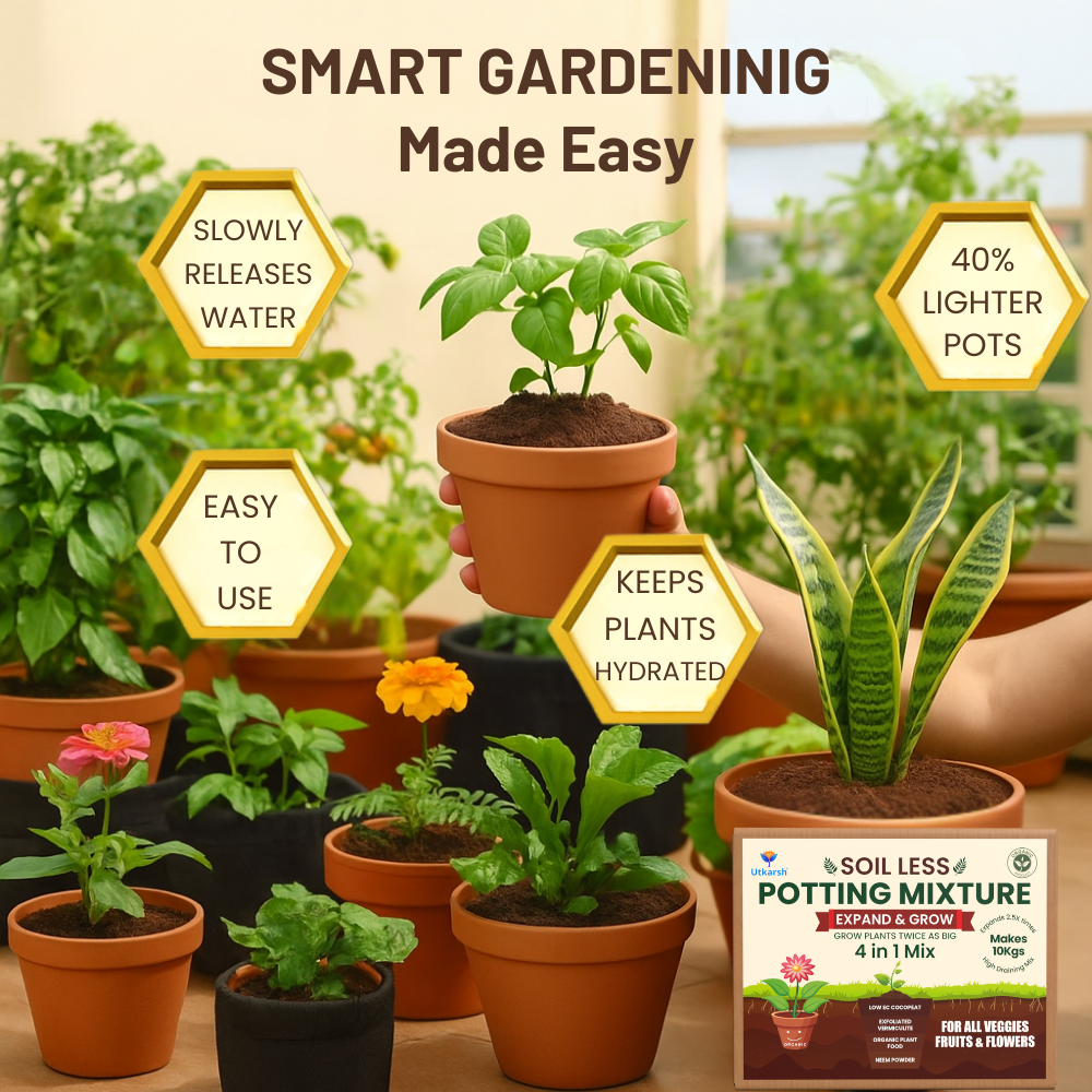- 🌱 Utkarsh Soil-Less 4 in 1 Potting Mix – Expands to 10 KG: Delivered in a compact dry block that expands into a nutrient-rich 10 kg potting mix once water is added. Made from pure, natural ingredients—no fillers, no adulteration (Comes in actual weight of 3.65 Kg).