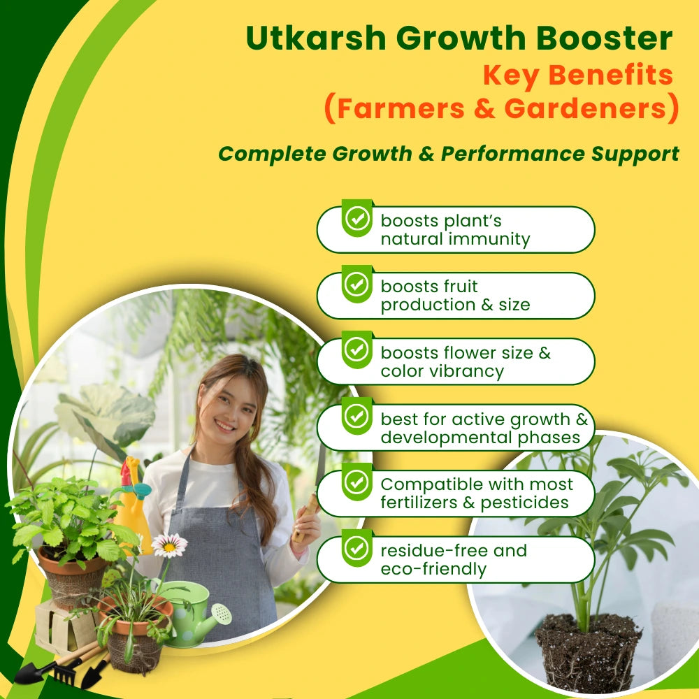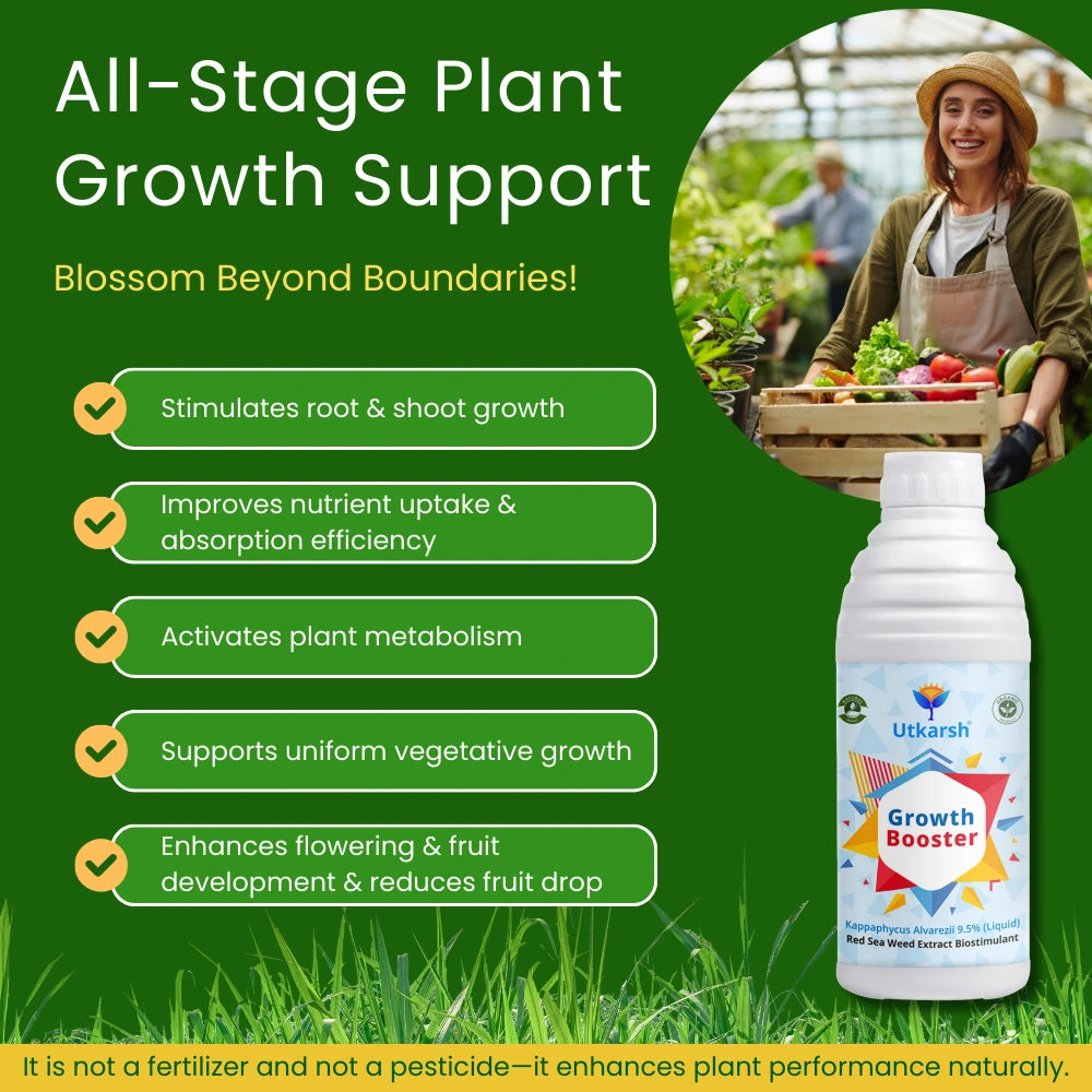 ✅ Utkarsh Growth Booster is an FCO-compliant liquid biostimulant made with Red Seaweed (Kappaphycus alvarezii) extract 9.5% (min.) and fortified with natural organic acids (Acetic, Citric & Lactic acids).