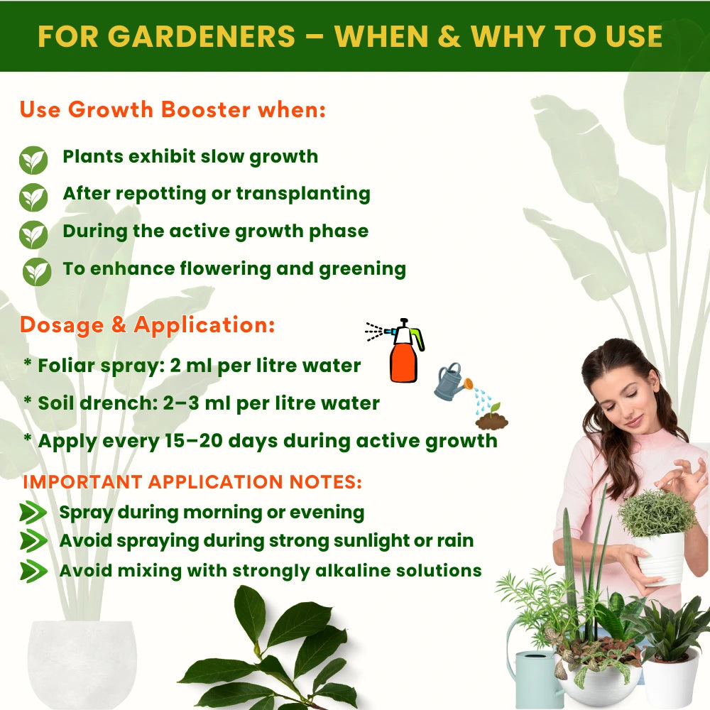 Use Growth Booster when: (1) Plants exhibit slow growth, (2) After repotting or transplanting, (3) During the active growth phase, (4) To enhance flowering and greening