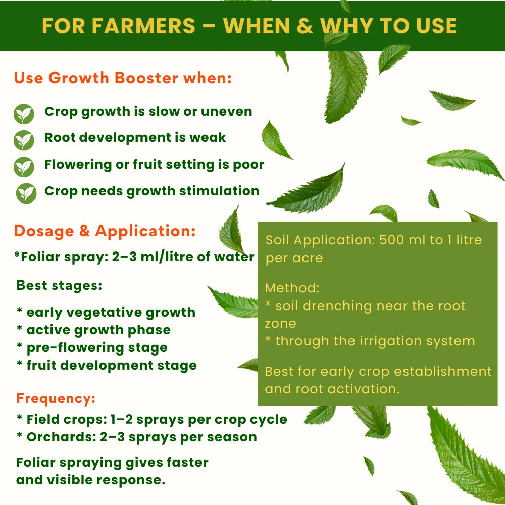 Use Growth Booster when: (1) Crop needs growth stimulation, (2) Root development is weak, (3) Crop needs growth stimulation, (4) Flowering or fruit setting is poor
