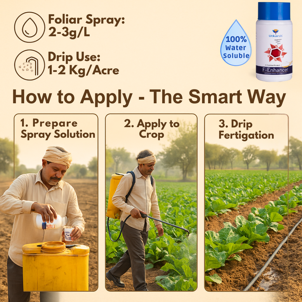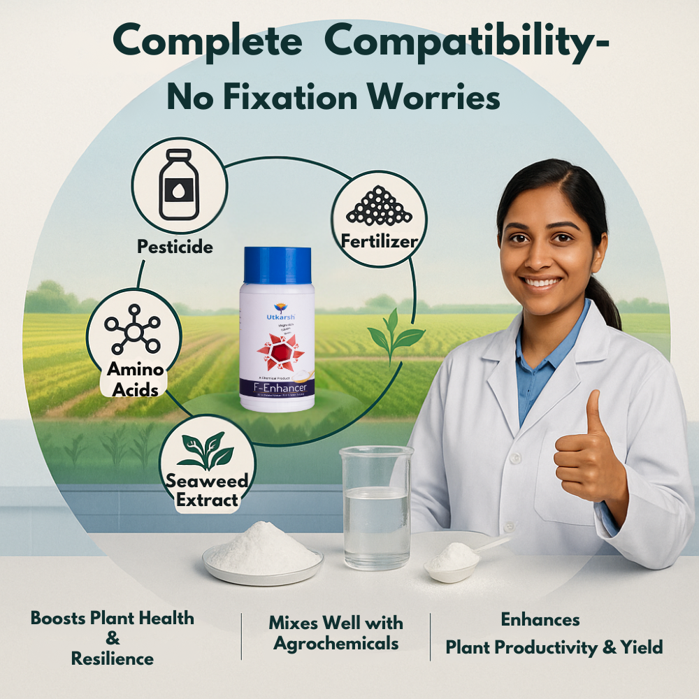 - Utkarsh F-Enhancer is 100% water-soluble and dissolves completely, making it ideal for use in foliar sprays and fertigation. Its chelated composition prevents fixation with other elements, ensuring maximum nutrient availability.