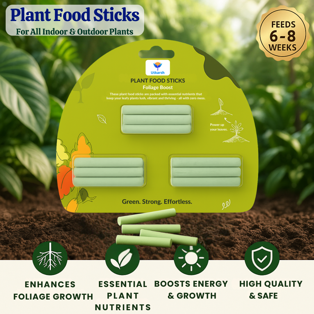 Give your plants the care they deserve with Utkarsh Plant Food Sticks available in 3 types for beautiful blooms, healthy roots and lush green foliage– the easy and effective way to keep plants healthy, vibrant, and thriving. Specially formulated with a balanced blend of essential nutrients, these slow-release sticks provide continuous nourishment to support strong root development, lush greenery, abundant flowers, and healthier fruits. Designed for convenience, simply insert the stick into the soil near the roots, and it will gradually feed your plants for up to 30 days—no mixing, no measuring, and no mess. Suitable for both indoor and outdoor plants, they are perfect for potted plants, balcony gardens, flower beds, and vegetable patches. Whether you’re a beginner or an experienced gardener, these multi-purpose fertilizer sticks ensure effortless plant care and long-lasting results with minimal effort.