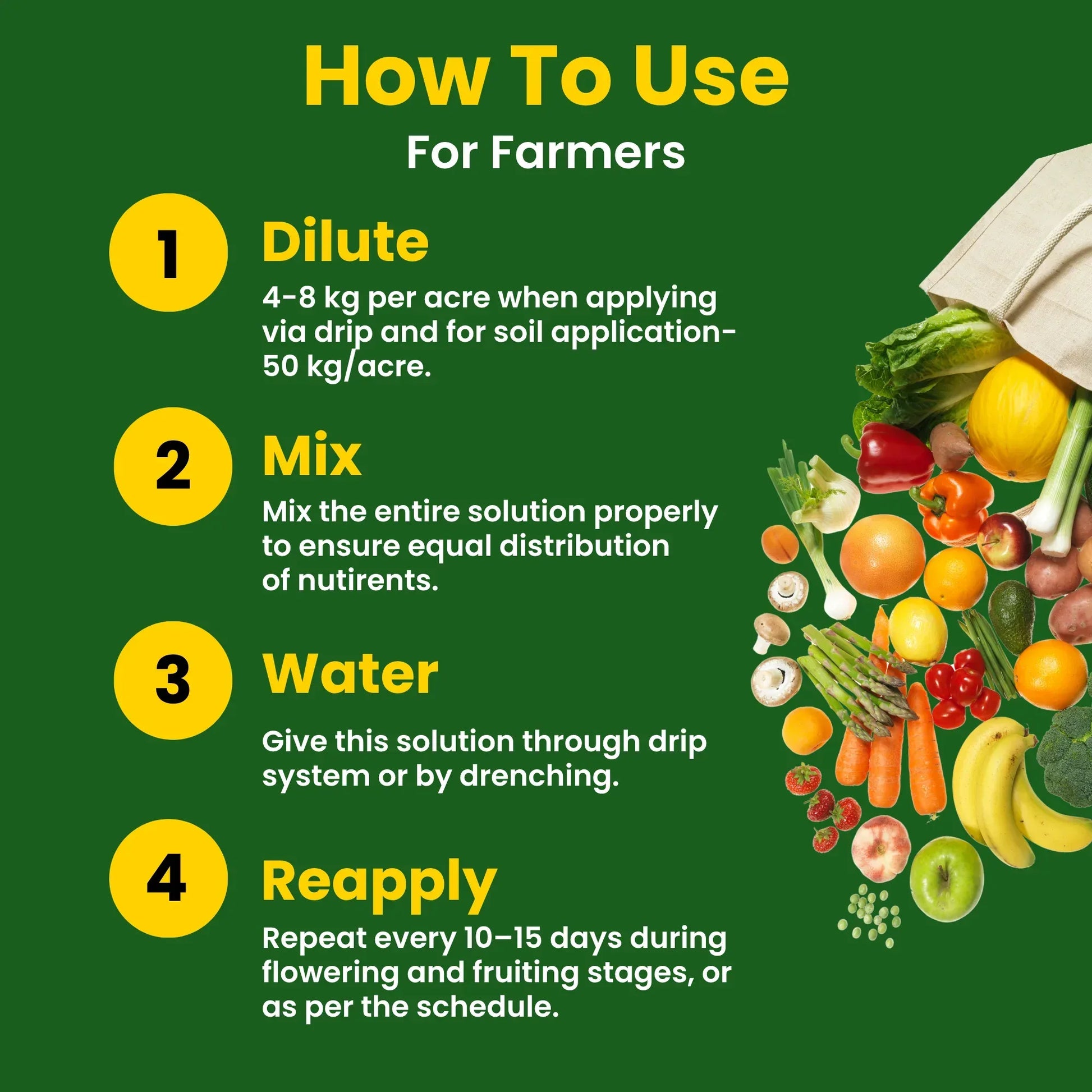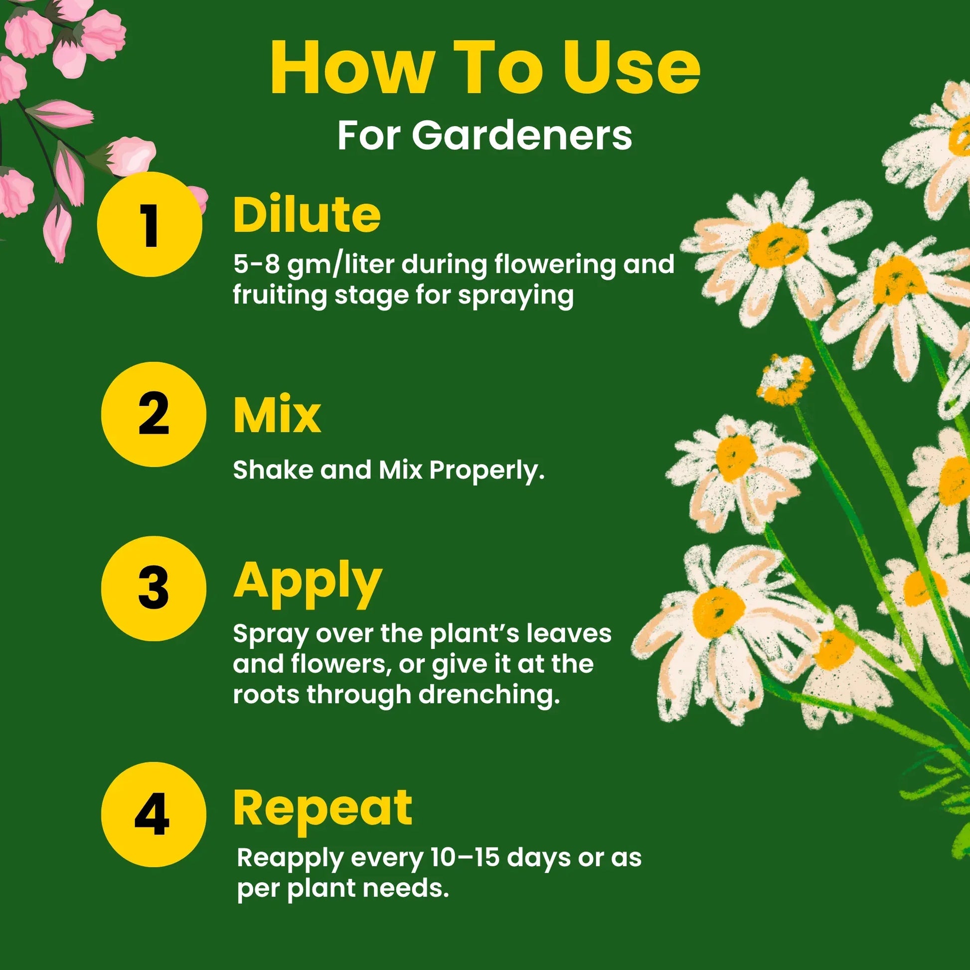 - For spraying: 5-8 gm/liter during flowering and fruiting stage