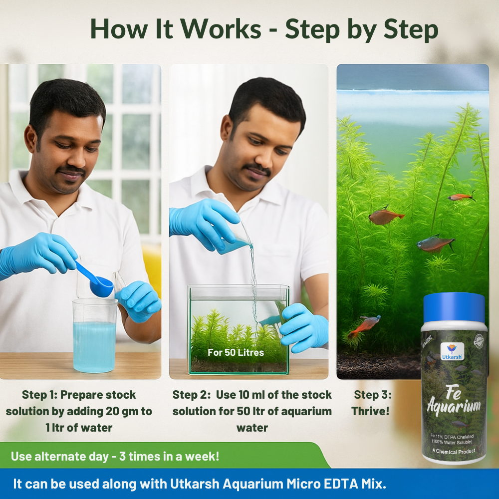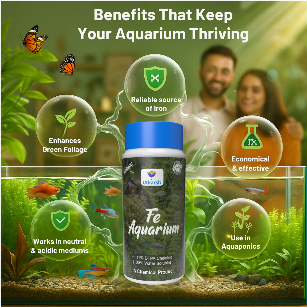 - Utkarsh Fe-Aquarium is a high-quality Chelated Iron DTPA supplement specially formulated to provide a reliable source of iron for plants grown in alkaline conditions.