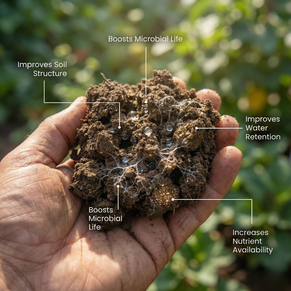 Improves soil structure, boosts microbial life, increases nutrient availability, improves water retention