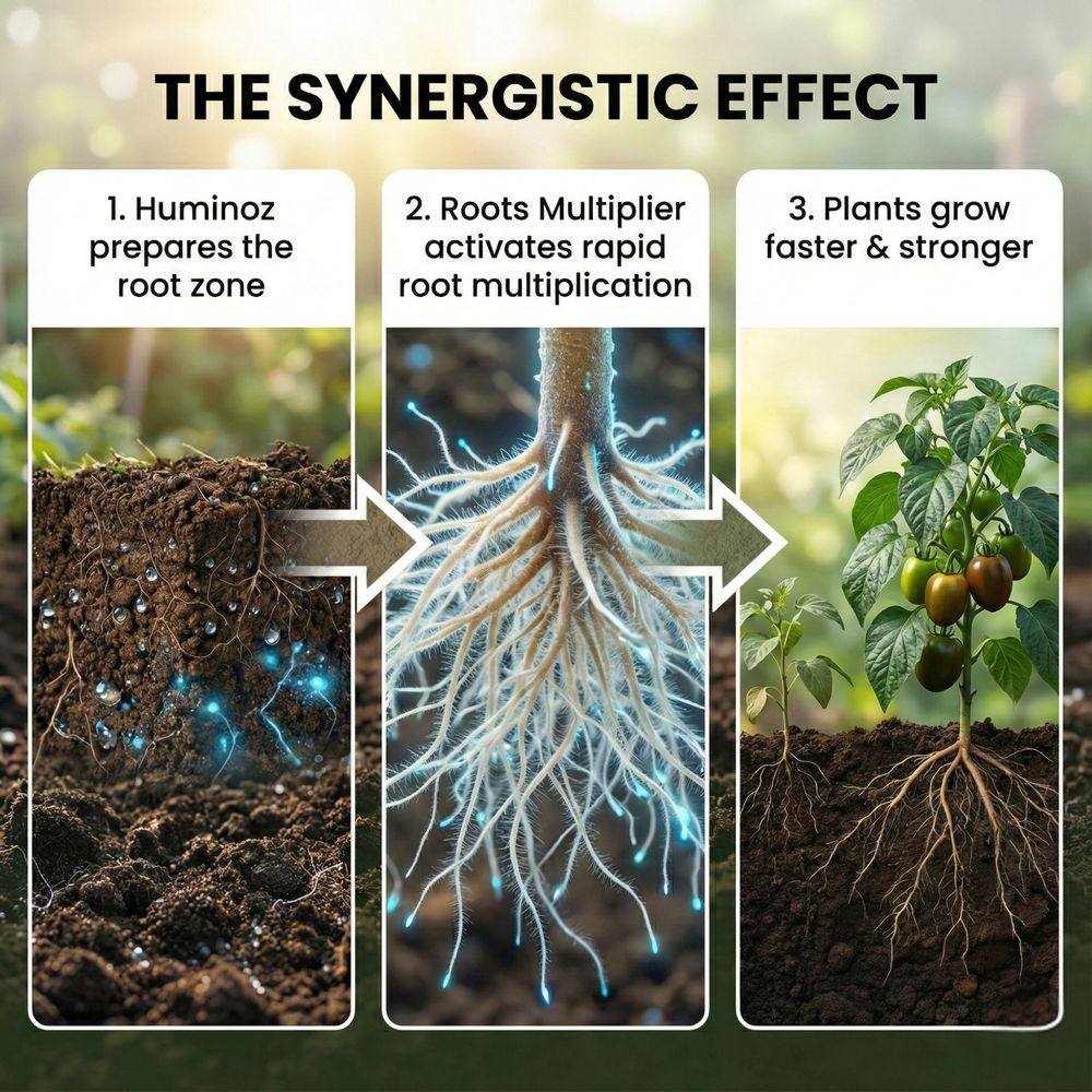 Huminoz prepares the root zone → Roots Multiplier activates rapid root multiplication → Plants grow faster & stronger