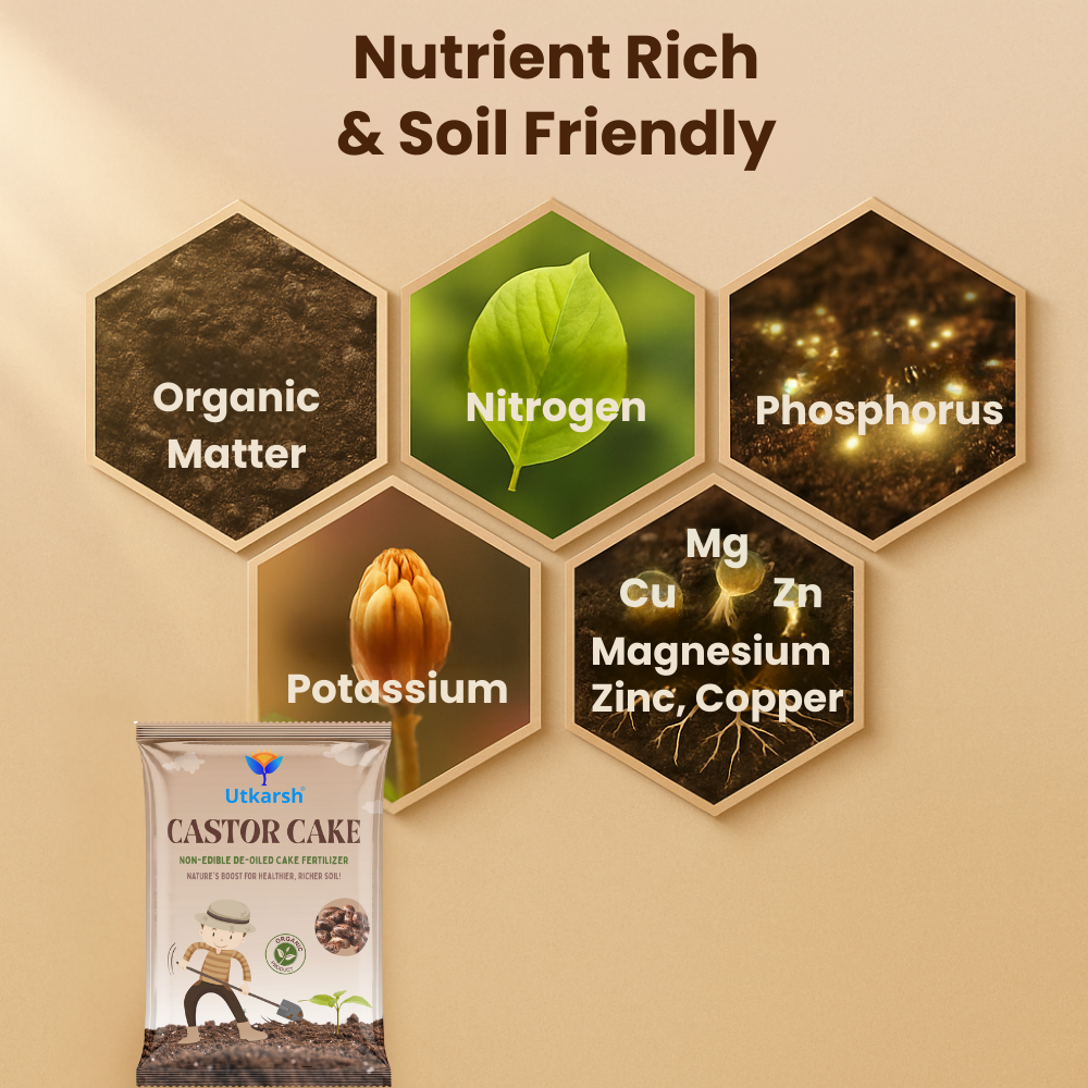 - Utkarsh Castor Cake enhances soil fertility without adverse effects, containing 58% organic matter, 5% nitrogen, 2% phosphorus, and 1.5% potassium, along with trace nutrients like magnesium, zinc, and copper.