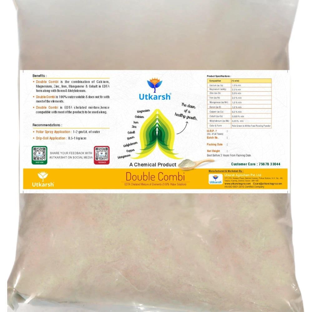 Double Combi is a unique formulation from Utkarsh Agrochem that combines secondary nutrients (Calcium, Magnesium) with a balanced mix of chelated micronutrients and Cobalt. It provides a complete nutrition package that addresses multiple deficiencies at once.