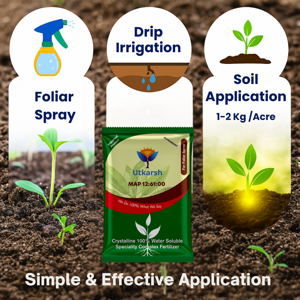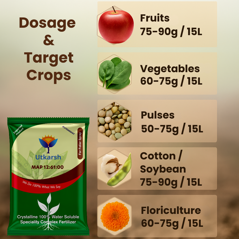 - Utkarsh MAP (12:61:00) is a water-soluble fertilizer containing the highest phosphorus (P) content available. MAP Can be applied along with all water-soluble fertilizers except calcium fertilizers.