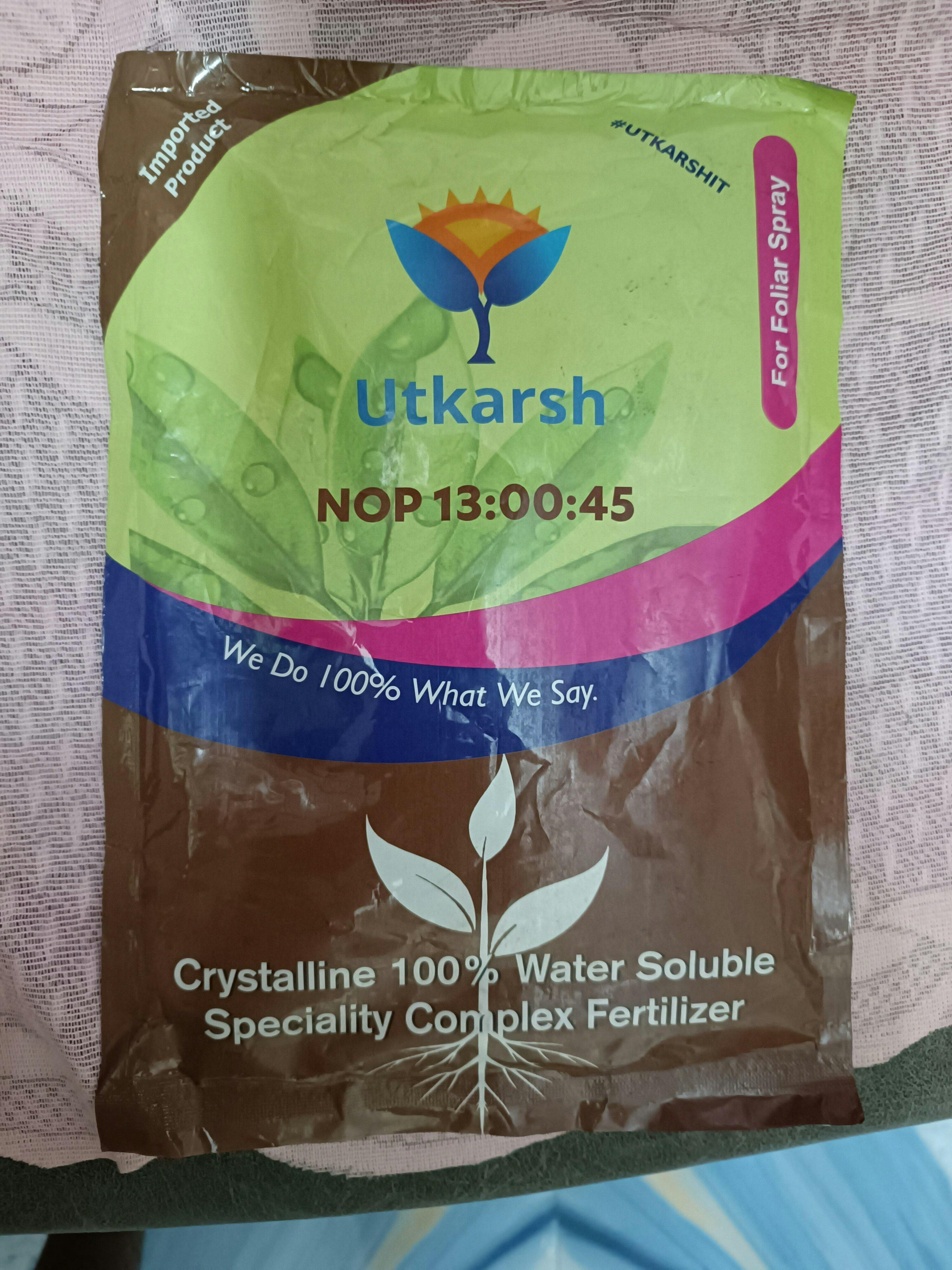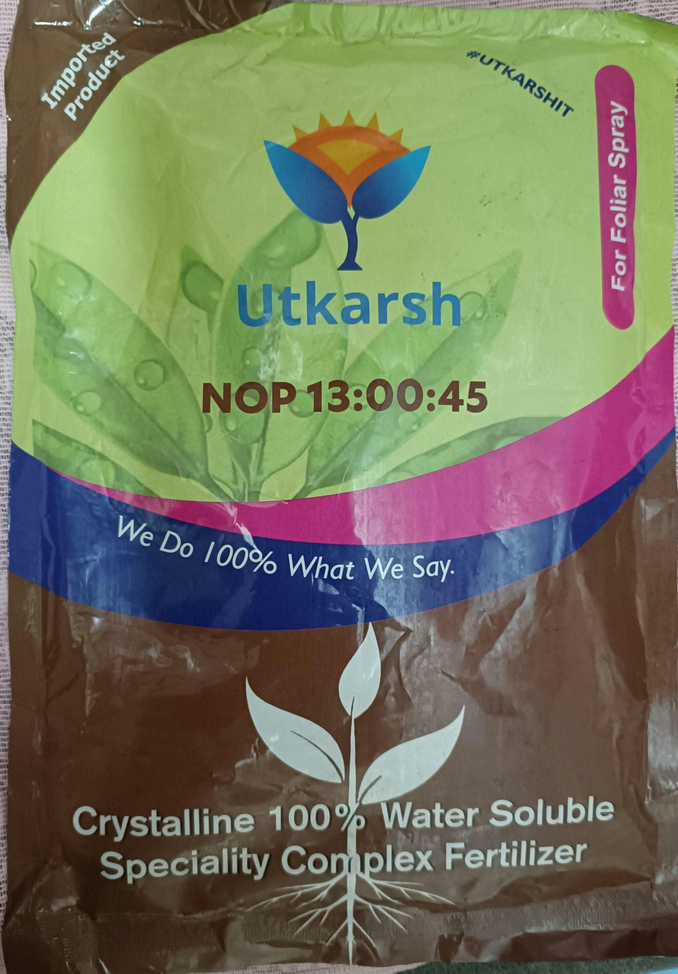 - Utkarsh NOP (13:00:45) is a free-flowing, fine crystalline Powder which dissolves speedily and completely in water to form a spray solution. NOP (13:00:45) is compatible with all water-soluble fertilizers and also a majority of pesticides in foliar application.
