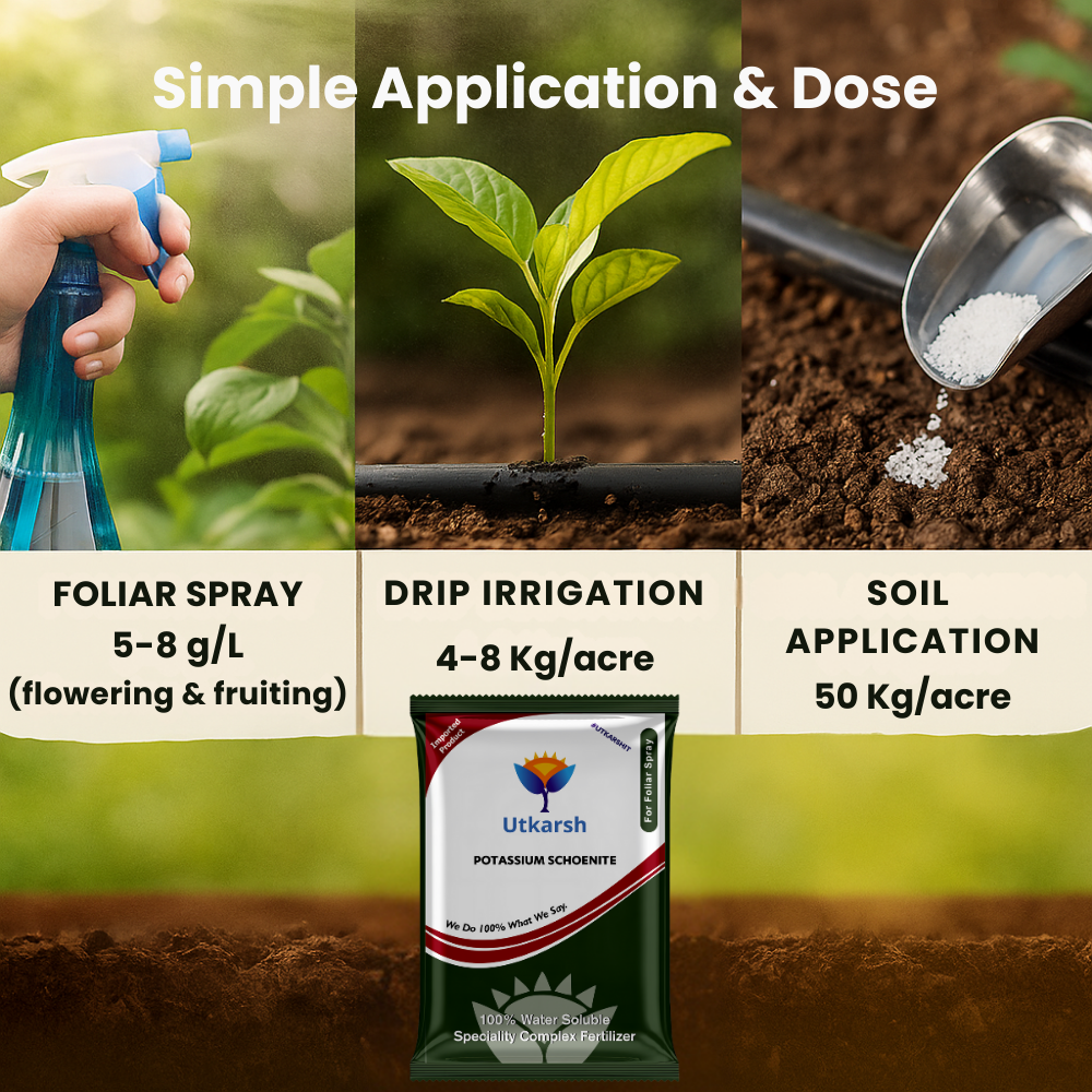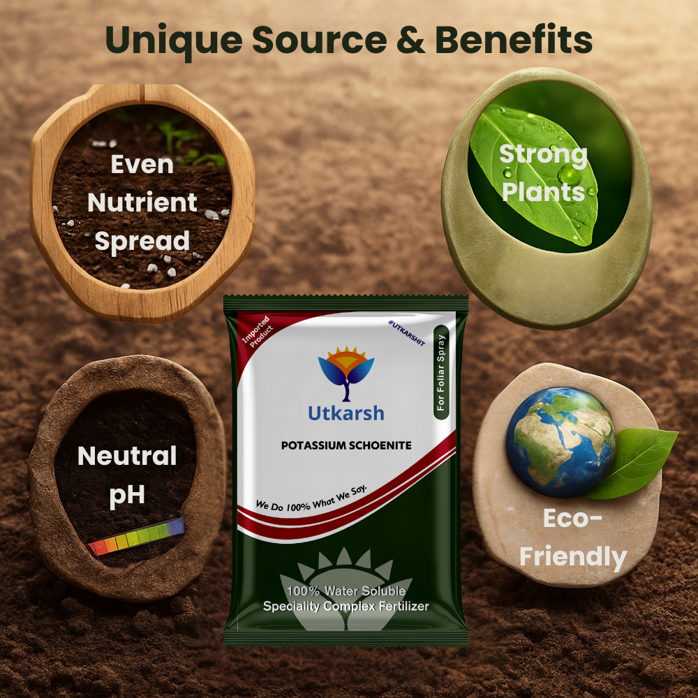- Utkarsh Potassium Schoenite has the advantage of having all nutrients contained within a single particle, which helps provide a uniform distribution of nutrients when it is spread in the field.