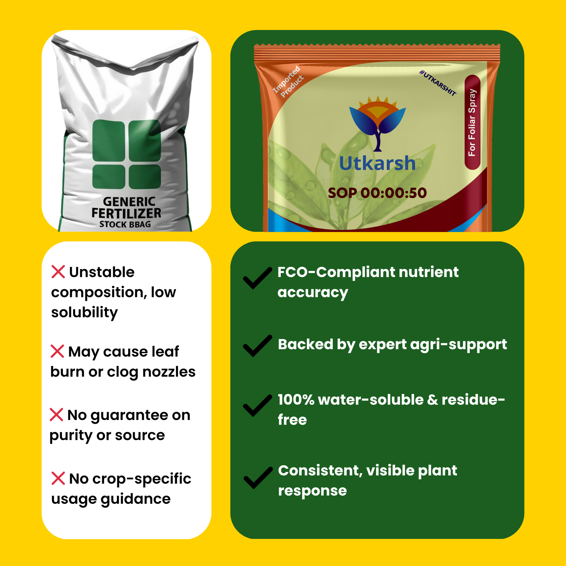 • Utkarsh SOP (00:00:50) is a COMPLIANT PRODUCT as per Fertilizer Control Order (FCO) 1985 under Schedule 1(c) containing Potassium Sulphate and having Water soluble Potassium (as K2O) 50% minimum and Sulphate Sulphur (as S) 17.5% minimum.