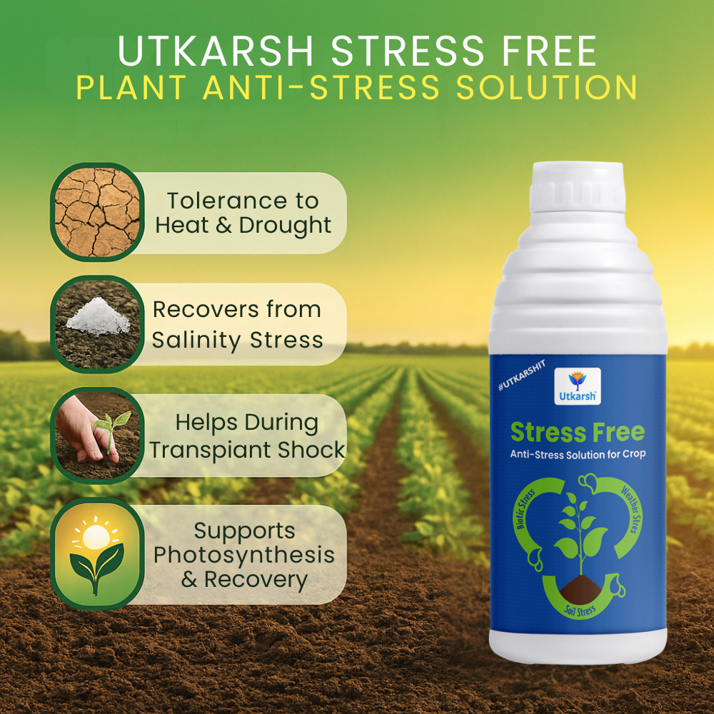 - Utkarsh Stress Free is also an anti-stress solution for all kinds of crops. It helps in photosynthesis, optimizes plant metabolism and improves nutrient and water uptake of roots.