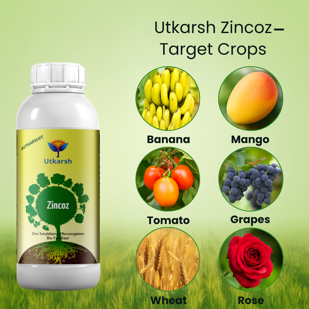 - Utkarsh Zincoz is a Zinc Solubilizing Biofertilizer that produces acids and converts the insoluble zinc sulphides, zinc oxide, and zinc carbonate into available Zn+ by lowering the soil pH and breaking down the complex.