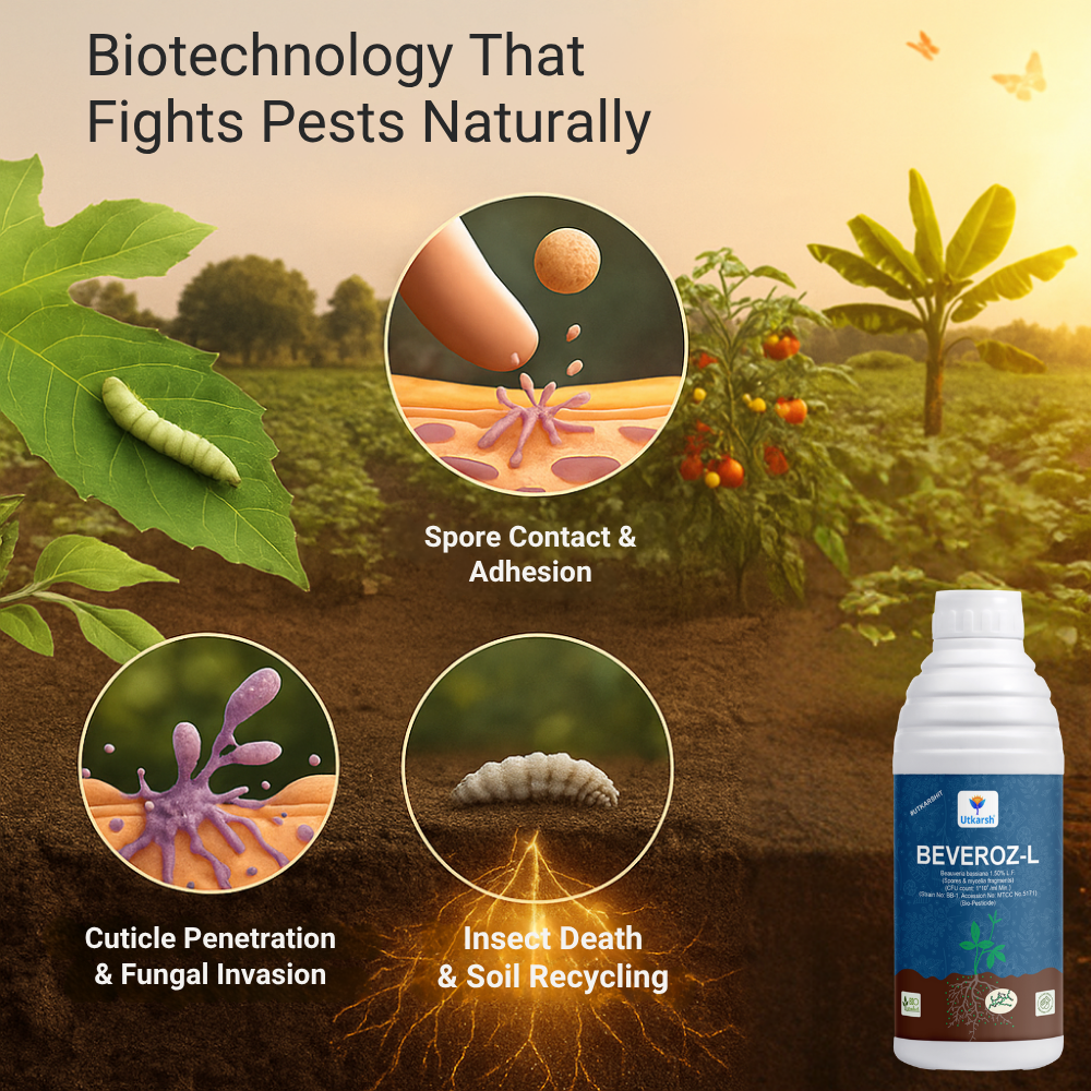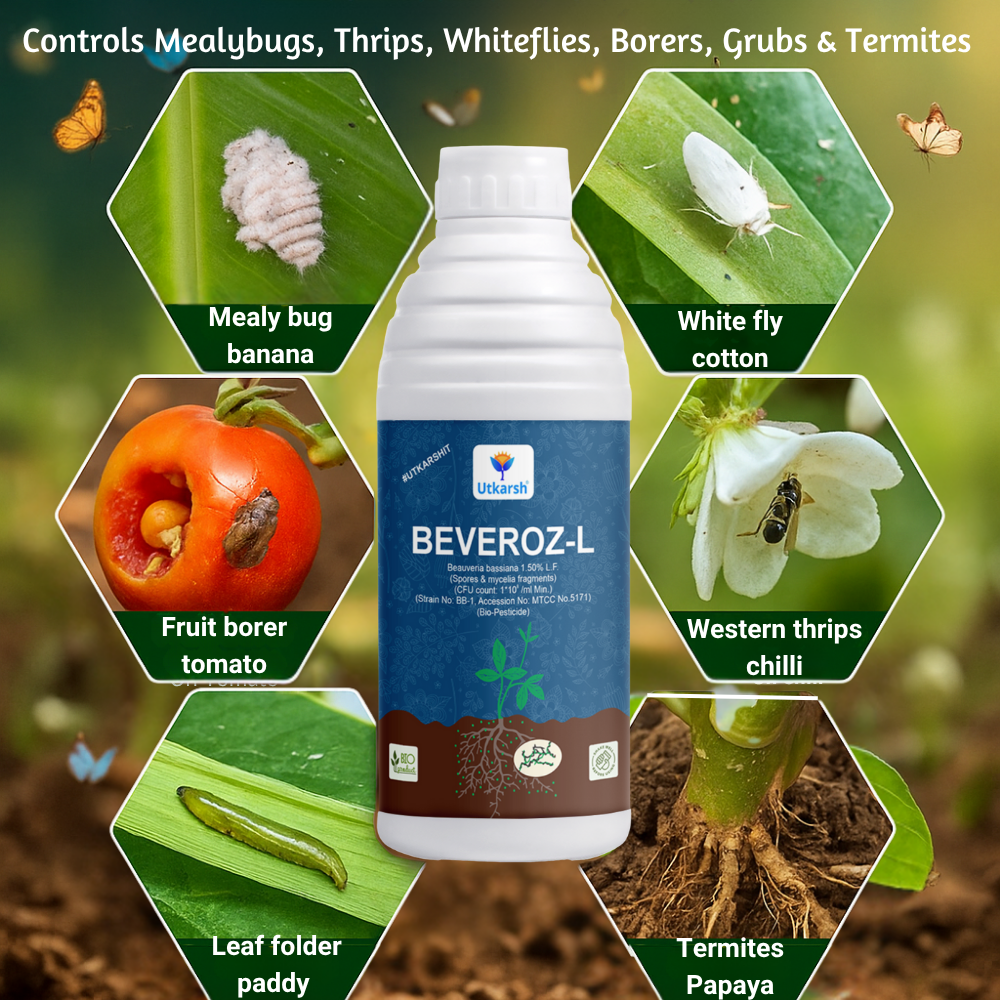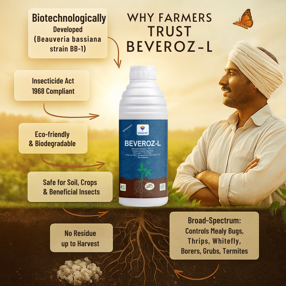 Utkarsh Beveroz-L is a biopesticide in powder form (1.50% L.f.) containing the fungus Beauveria bassiana, used to control insect pests in agriculture, horticulture, and home gardening.