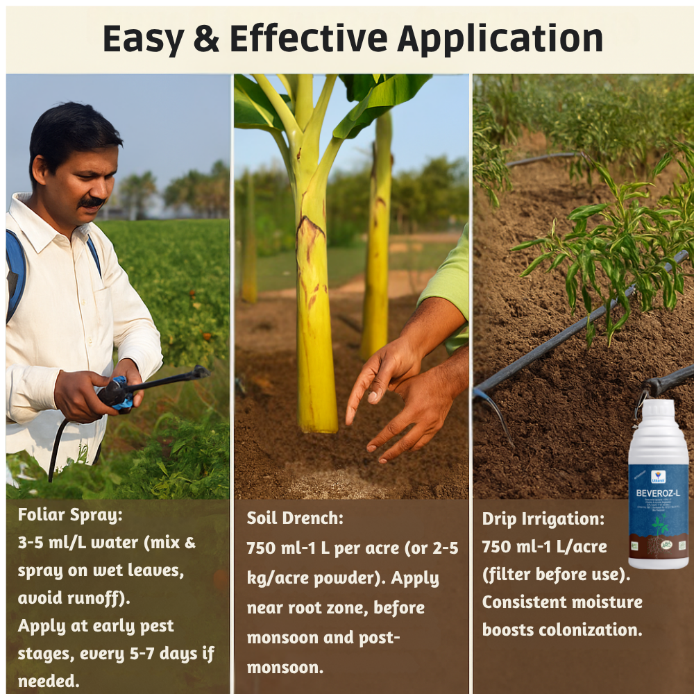 - Apply as drench, or through drip irrigation (1–2 kg/acre).